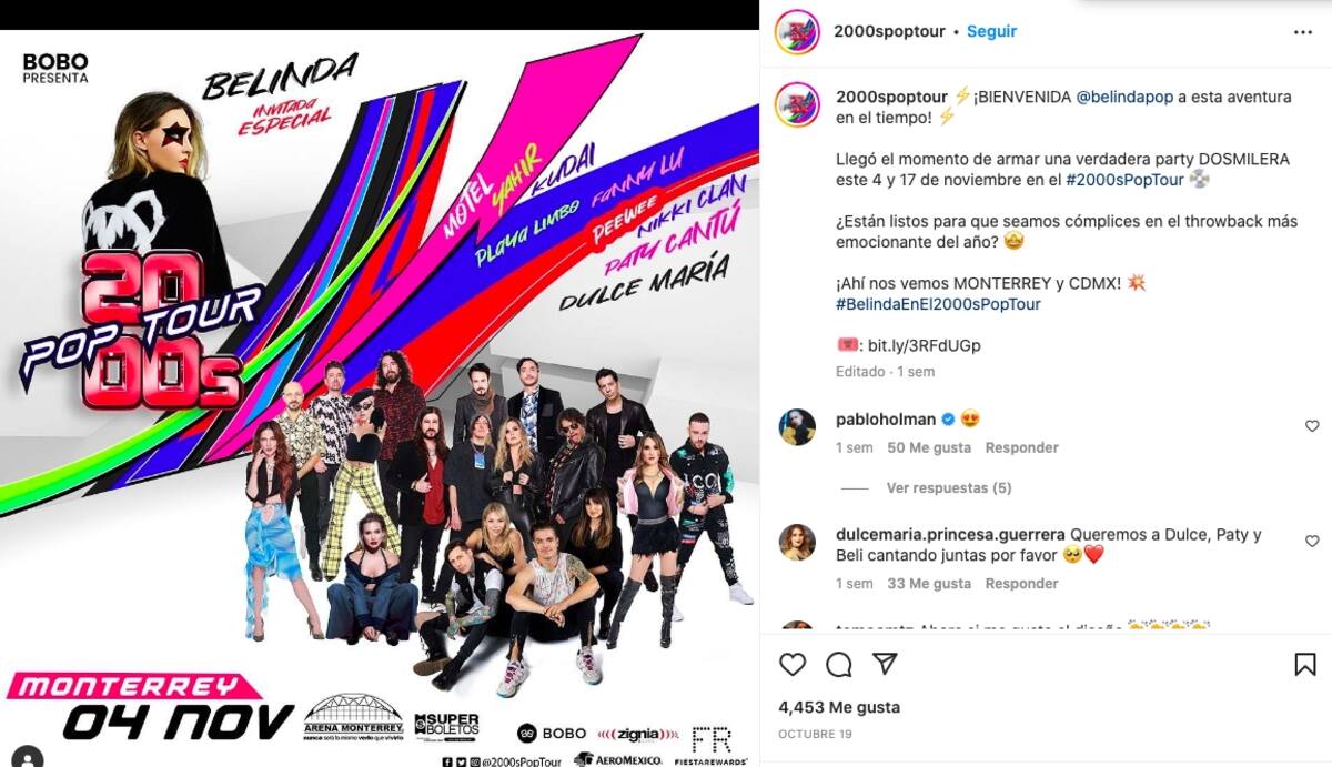 El éxito del espectáculo 2000s Pop Tour es indudable. Sin embargo, Dulce María, una de los integrantes del elenco, dejará el evento y sus últimas fechas serán el 4 de noviembre, en la Arena Monterrey, y el 17 de noviembre, en la Arena Ciudad de México.