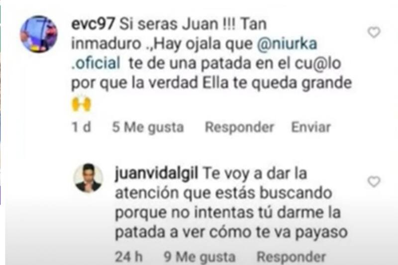 Al ver el comentario de un fan de Niurka que le escribió, “si serás Juan. Tan inmaduro. Ay, ojalá que Niurka te de una patada en el culo porque la verdad ella te queda grande”, no tardó en responder: “Te voy a dar la atención que estás buscando. Por qué no intentas tú darme la patada a ver cómo te va payaso”.