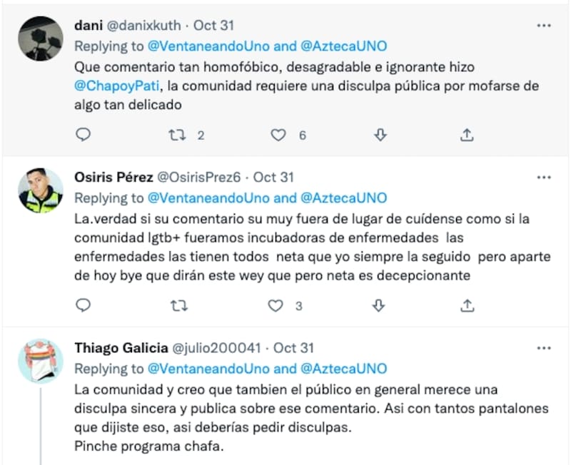 Otro comentó: "La verdad, su comentario estuvo fuera de lugar. (Decir) cuídense, (es) como si la comunidad LGBT+ fuéramos incubadoras de enfermedades. Las enfermedades las tienen todos". Y en uno más se lee: "La comunidad y creo que también el público en general, merece una disculpa sincera y pública sobre ese comentario. Así con tantos pantalones que dijiste eso, así deberías pedir disculpas".