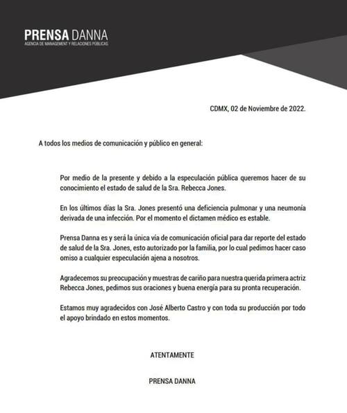 "Rebecca ha trabajado y cumplido con todas sus obligaciones dentro de la novela de Castro, al cuál le agradecemos muchísimo su apoyo en estos momentos. Han estado super pendientes y respetando el lugar de Rebecca dentro de la telenovela para que ella regrese con todas las ganas ahora que ya esté mejor de salud", dijo.
