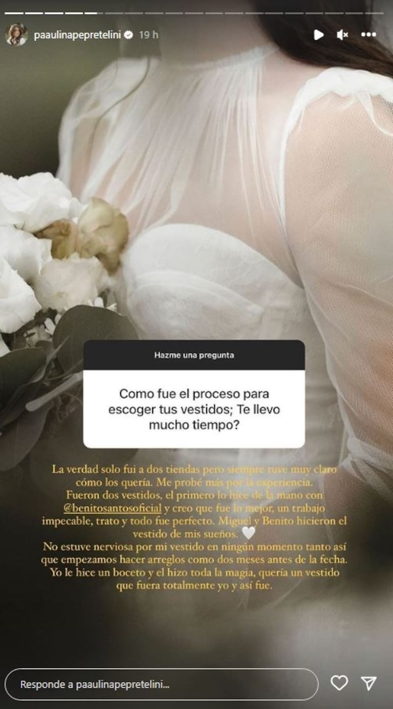 En otra historia compartió que el segundo vestido fue de Ángeles Godoy, su peinado y maquillaje fue obra de Fertz Pedraza y Beatriz Cisneros y finalmente los servicios de wedding planner estuvieron a cargo de Gutiérrez Studio.