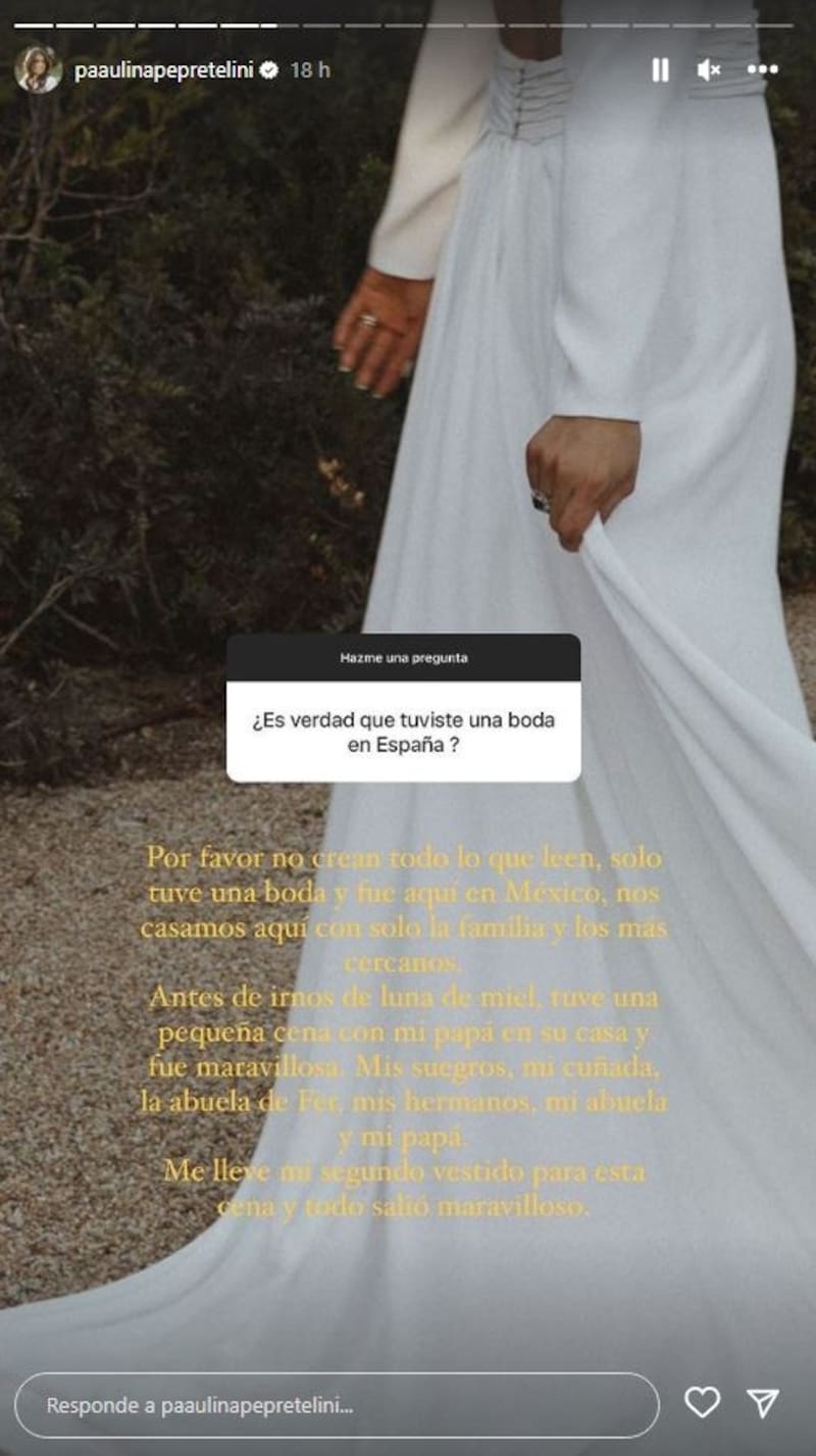 "No crean todo lo que leen, solo tuve una boda y fue aquí en México. Nos casamos aquí con solo la familia y los más cercanos", explicó. "Antes de irnos de luna de miel, tuve una pequeña cena con mi papá en su casa y fue maravillosa. Mis suegros, mi cuñada, la abuela de Fer, mis hermanos, mi abuela y mi papá. Me llevé mi segundo vestido para esta cena y todo salió maravilloso", sentenció.