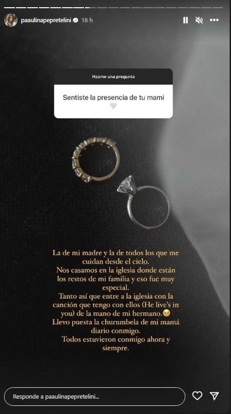 "La de mi madre y la de todos los que me cuidan desde el cielo. Nos casamos en la iglesia donde están los restos de mi familia y eso fue muy especial. Tanto así que entré a la iglesia con la canción que tengo con ellos (He live's in you) de la mano de mi hermano. Llevo puesta la churumbela de mi mamá a diario conmigo. Todos estuvieron conmigo ahora y siempre", añadió.