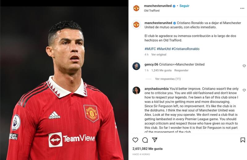 Cristiano Ronaldo está en estos momentos en Qatar para participar en la Copa del Mundo con Portugal, que debutará contra Ghana el jueves por el Grupo H. "Después de las conversaciones con el Manchester United, hemos acordado rescindir nuestro contrato antes de tiempo. Amo al Manchester United y amo a los fanáticos, eso nunca cambiará. Sin embargo, siento que es el momento adecuado para buscar un nuevo desafío", dijo el delantero en un comunicado.