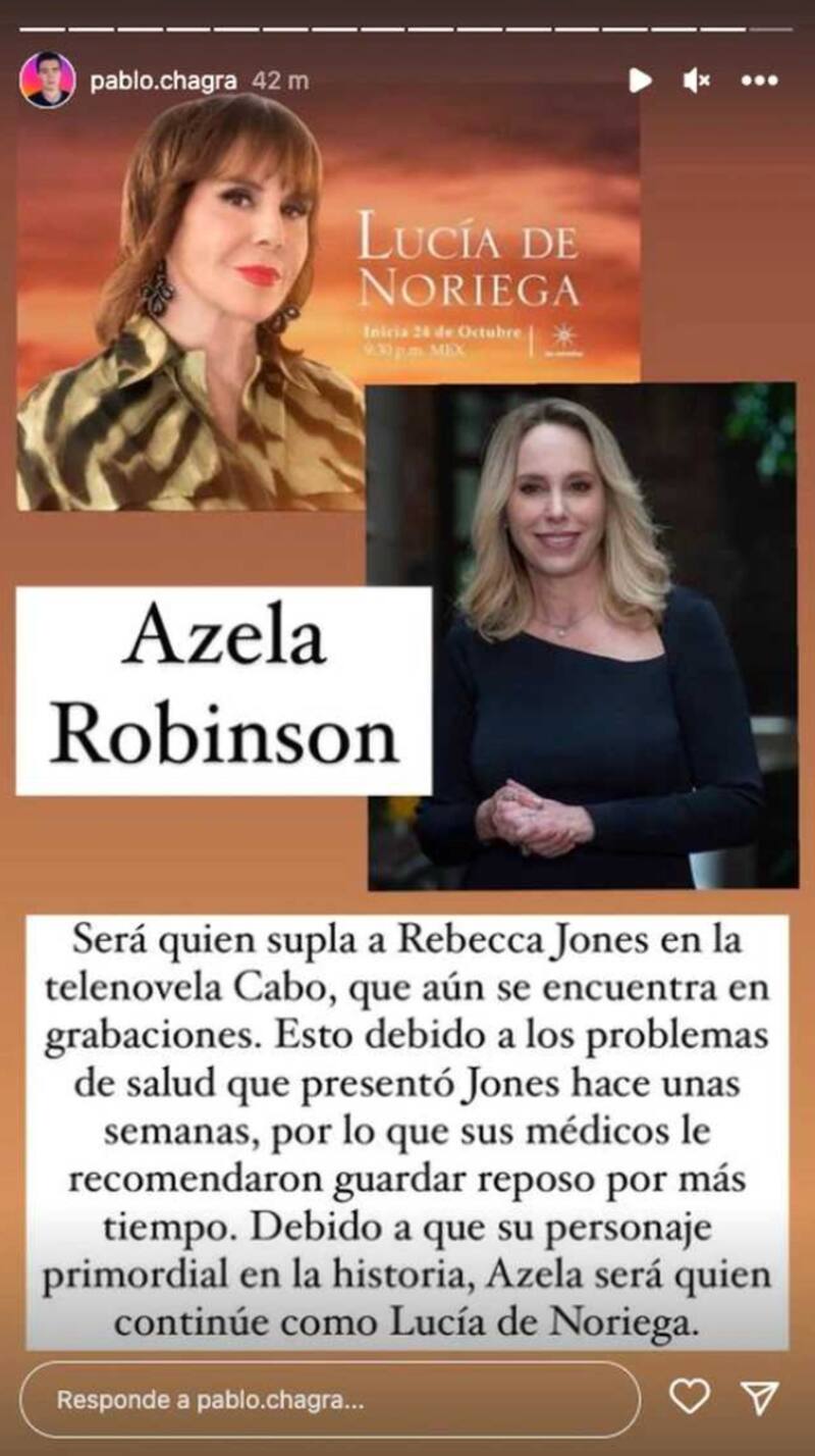 “Azela Robinson será quien supla a Rebecca Jones en la telenovela Cabo, que aún se encuentra en grabaciones. Esto debido a los problemas de salud que presentó Hones hace unas semanas, por lo que sus médicos le recomendaron guardar reposo por más tiempo. Debido a que su personaje es primordial en la historia, Azalea será quien continúe como Lucía de Noriega”.