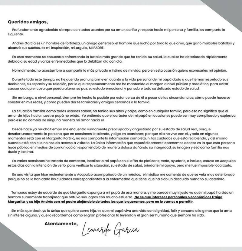 Dijo que el estado de salud de su padre "se ha deteriorado rápidamente debido a su edad y a varias enfermedades que lo debilitan día con día", como el mismo actor lo ha externado mediante sus redes sociales. En ese sentido, Leonardo García señaló que se siente "sumamente preocupado y angustiado por su estado de salud real".
