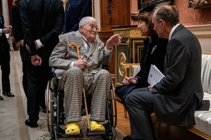 Para asistir a un evento de la Familia Real una vestimenta formal es lo apropiado para llevar, sin embargo, el rey Carlos III permitió que David Hockney acudiera con el alcanzado de su elección. El artista, quien usa silla de ruedas, apareció con un par de zapatos crocs en un color amarillo brillante.