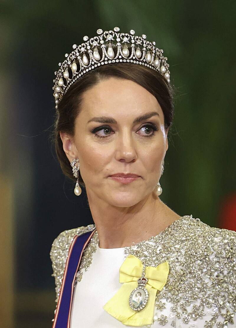 Kate Middleton deslumbró con su aparición en la cena de Estado que ofreció el Palacio de Kensington en la visita del presidente de Sudáfrica, Cyril Ramaphosa, y su esposa, la primera dama Tshepo Motsepe, al Reino Unido con la tiara favorita de la princesa Diana y un espectacular vestido blanco de Jenny Packham.