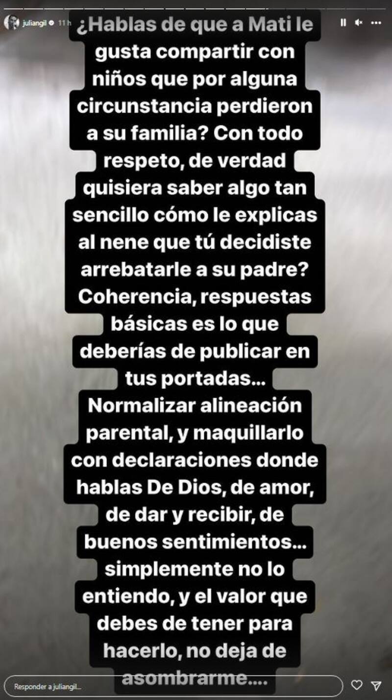 "Normalizar alienación parental y maquillarlo con declaraciones donde hablas de Dios, de amor, de dar y recibir, de buenos sentimientos... simplemente no lo entiendo. Y el valor que debes de tener para hacerlo no deja de asombrarme", mencionó.