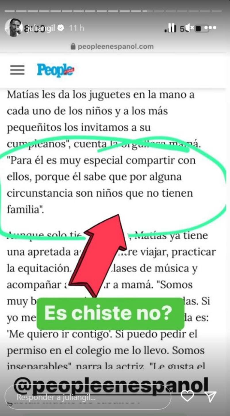 El actor argentino utilizó su cuenta de Instagram para pronunciarse a las declaraciones que hizo la también actriz en dicha publicación en donde habla de cómo es su hijo, sus pasatiempos y lo empático que es cuando convive con niños de su edad que por ciertas circunstancias no cuentan con el cariño de su familia.