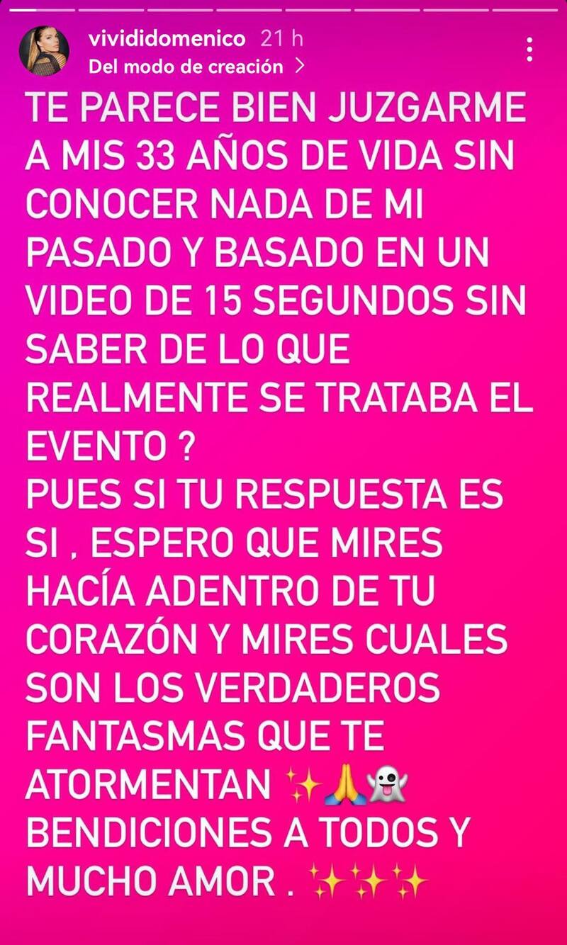 "¿Te parece bien juzgarme a mis 33 años de vida sin conocer nada de mi pasado y basado en un video de 15 segundos sin saber de lo que realmente se trataba el evento? Pues si tu respuesta es 'sí', espero que mires hacia adentro de tu corazón y mires cuáles son los verdaderos fantasmas que te atormentan. Bendiciones a todos y mucho amor", escribió.