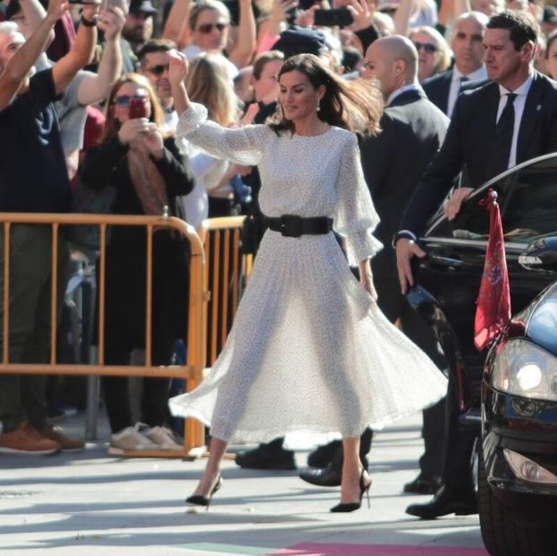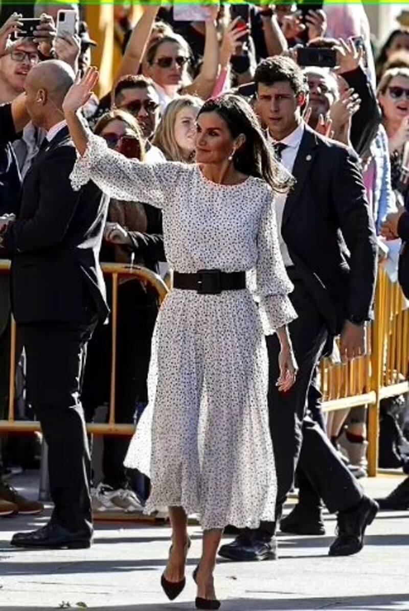 La esposa del rey Felipe rescató de su armario uno de los vestidos más elegantes y atemporales que tiene en su clóset. Se trata de un diseño de Emporio Armani con lunares blanco y negro que estrenó en febrero de 2020 y durante una visita que los monarcas hicieron a Huelva y Cádiz.