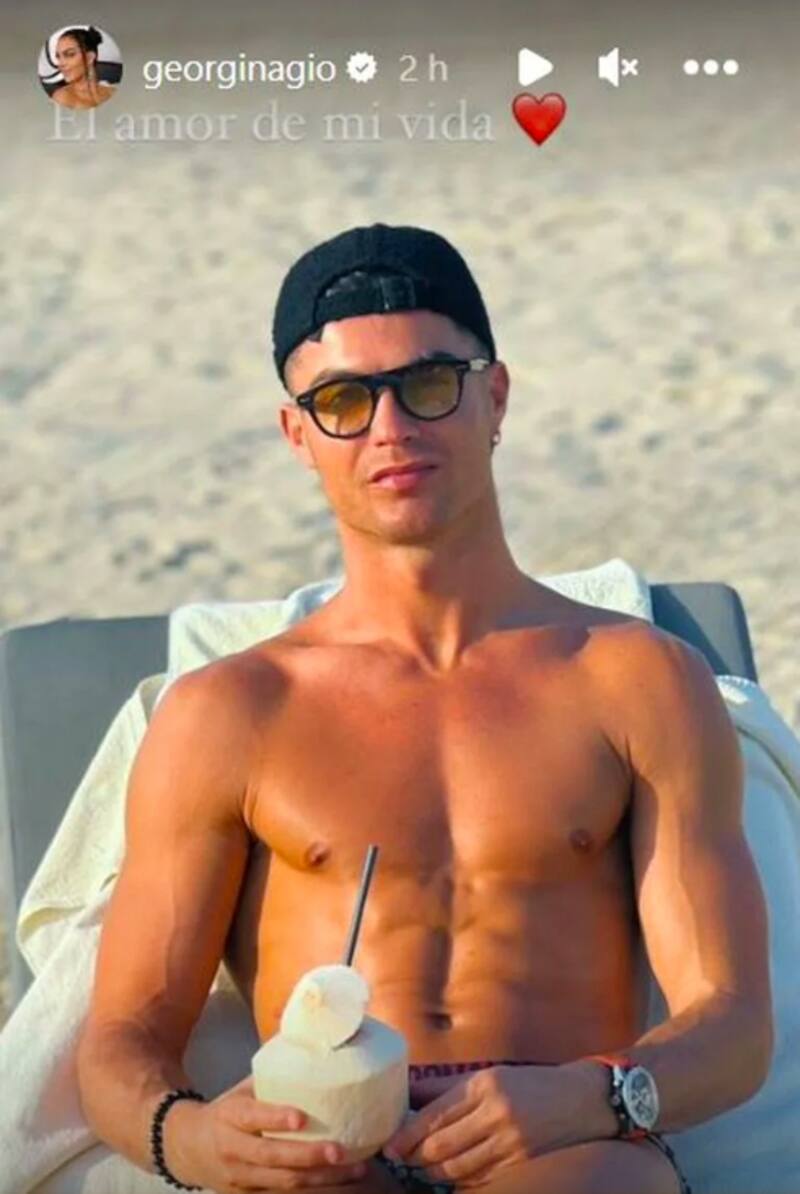 En la siguiente imagen vemos a Cristiano Ronaldo disfrutando de unos días de descanso sin camiseta, lentes obscuros y con una bebida en la mano, muy alejado a su trabajo como futbolista. Junto a la imagen escribió que era el amor de su vida.