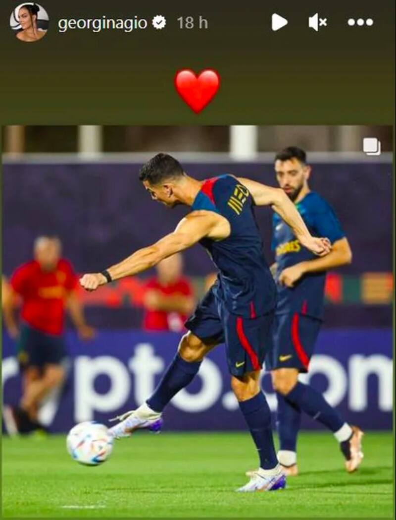 En la primera de sus historias, Georgina Rodríguez compartió una fotografía de su pareja con la camiseta de entrenamiento de la selección de Portugal junto a un emoji de corazón para demostrarle su amor.