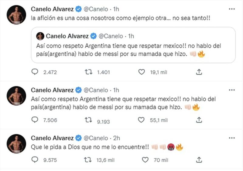 Y fue por este enojo, que el puglista decidió escribir bastante molesto en Twitter: “Vieron a Messi limpiando el piso con nuestra playera y bandera ????”, preguntó Canelo: “Así como respeto Argentina, tiene que respetar México. No hablo del país (Argentina), hablo de Messi por su mamada que hizo”, continuó.