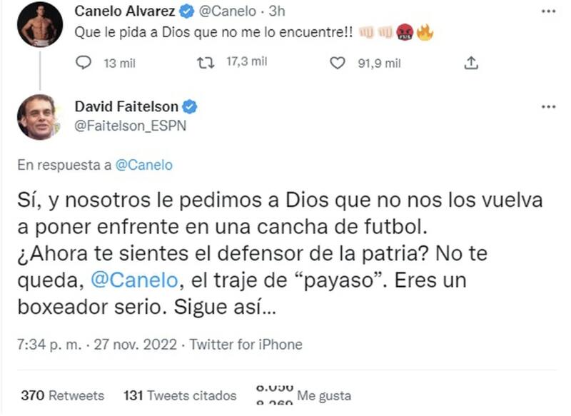 “Sí, y nosotros le pedimos a Dios que no nos los vuelva a poner enfrente en una cancha de futbol. ¿Ahora te sientes el defensor de la patria? No te queda, @Canelo, el traje de ‘payaso’. Eres un boxeador serio. Sigue así…”, redactó Faitelson en su Twitter.