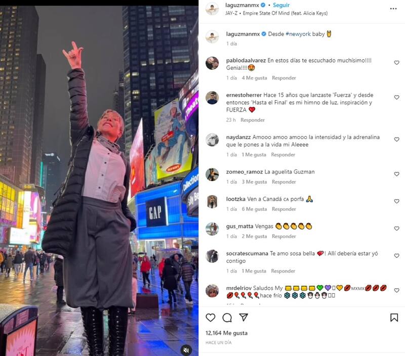"Desde #newyork baby", escribió la Guzmán como mensaje para acompañar las imágenes en las que se le ve en una actitud muy roquera.