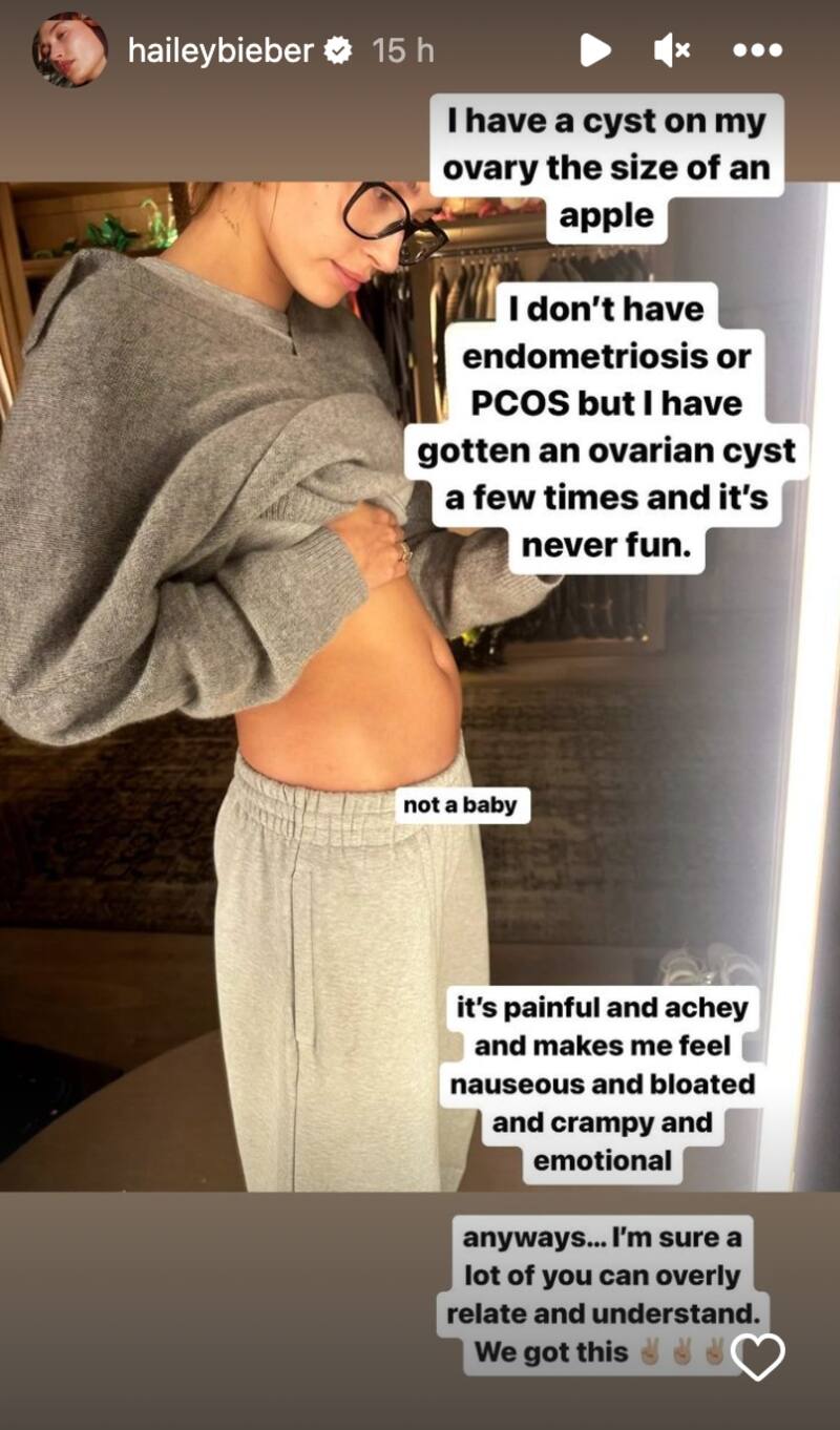 A través de su cuenta oficial de Instagram Hailey Bieber compartió una imagen en sus historias donde se le ve con el abdomen al descubierto. "Tengo un quiste en mi ovario del tamaño de una manzana. No tengo endometriosis, no tengo síndrome de ovario poliquístico, pero sí he tenido quistes algunas veces y nunca ha sido divertido", reveló.