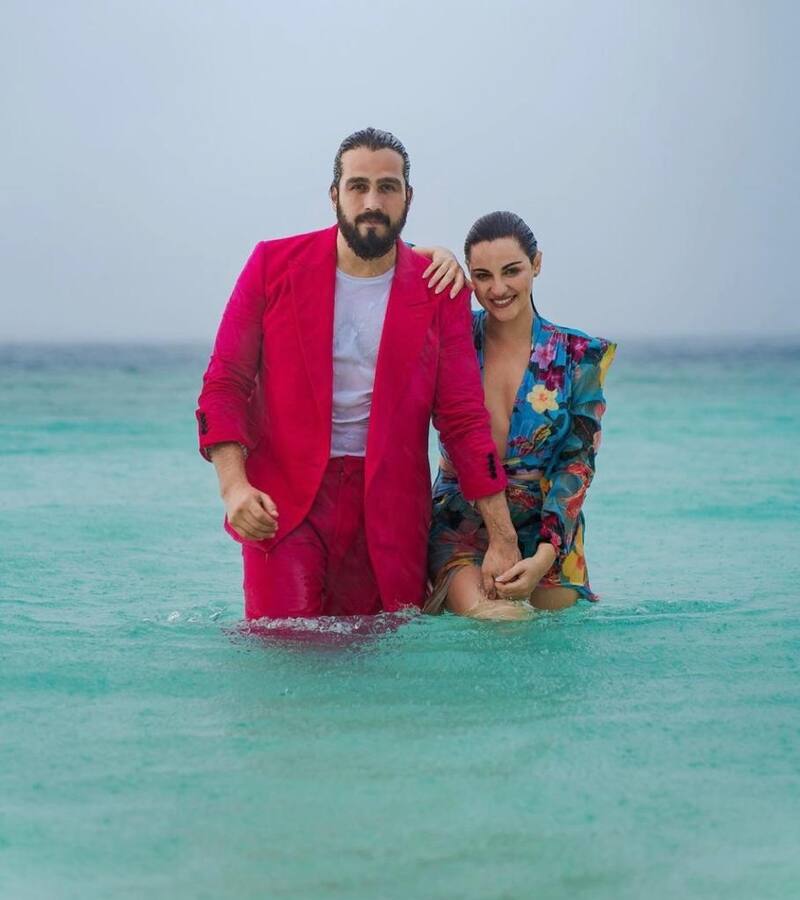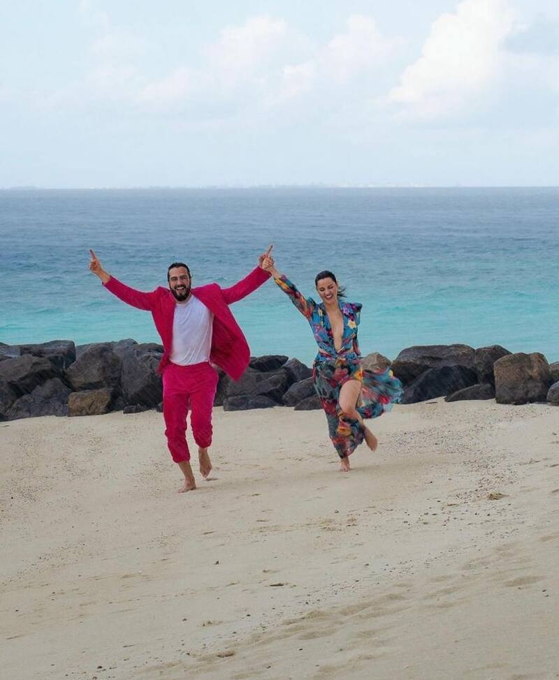 Andrés Tovar portó un traje color fucsia y la actriz usa un vestido con estampado de flores. En una de las imágenes se ve a ambos dentro del mar; en otra fotografía, el productor carga a su esposa y se dan un beso. En una más, están corriendo por la arena.