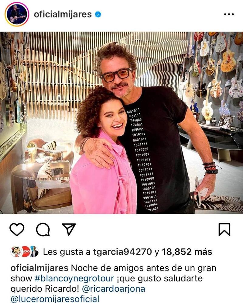 "Noche de amigos antes de un gran show #blancoynegrotour ¡Que gusto saludarte querido Ricardo!", escribió Manuel Mijares junto con una fotografía de Lucerito con Arjona, donde se logra apreciar que su hija está muy feliz.