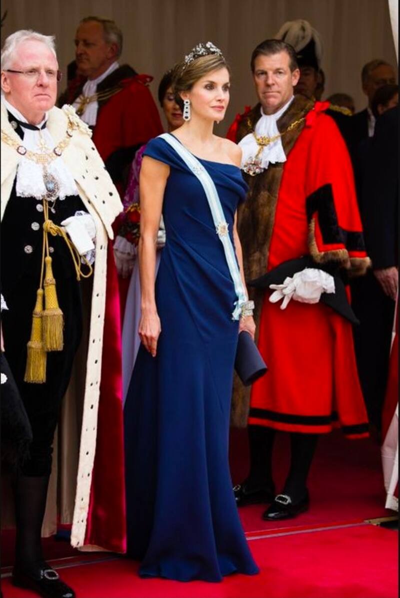 Se trata de una favorecedora prenda de líneas depuradas color azul, escote asimétrico y detalles drapeados. La usó en el 2017 para la cena de gala que el alcalde de la ciudad celebró en honor a sus Majestades los Reyes de España. Un modelo minimalista pero muy elegante y sofisticado que acompañó con un clutch metalizado, zapatillas doradas e impresionantes aretes con zafiros.