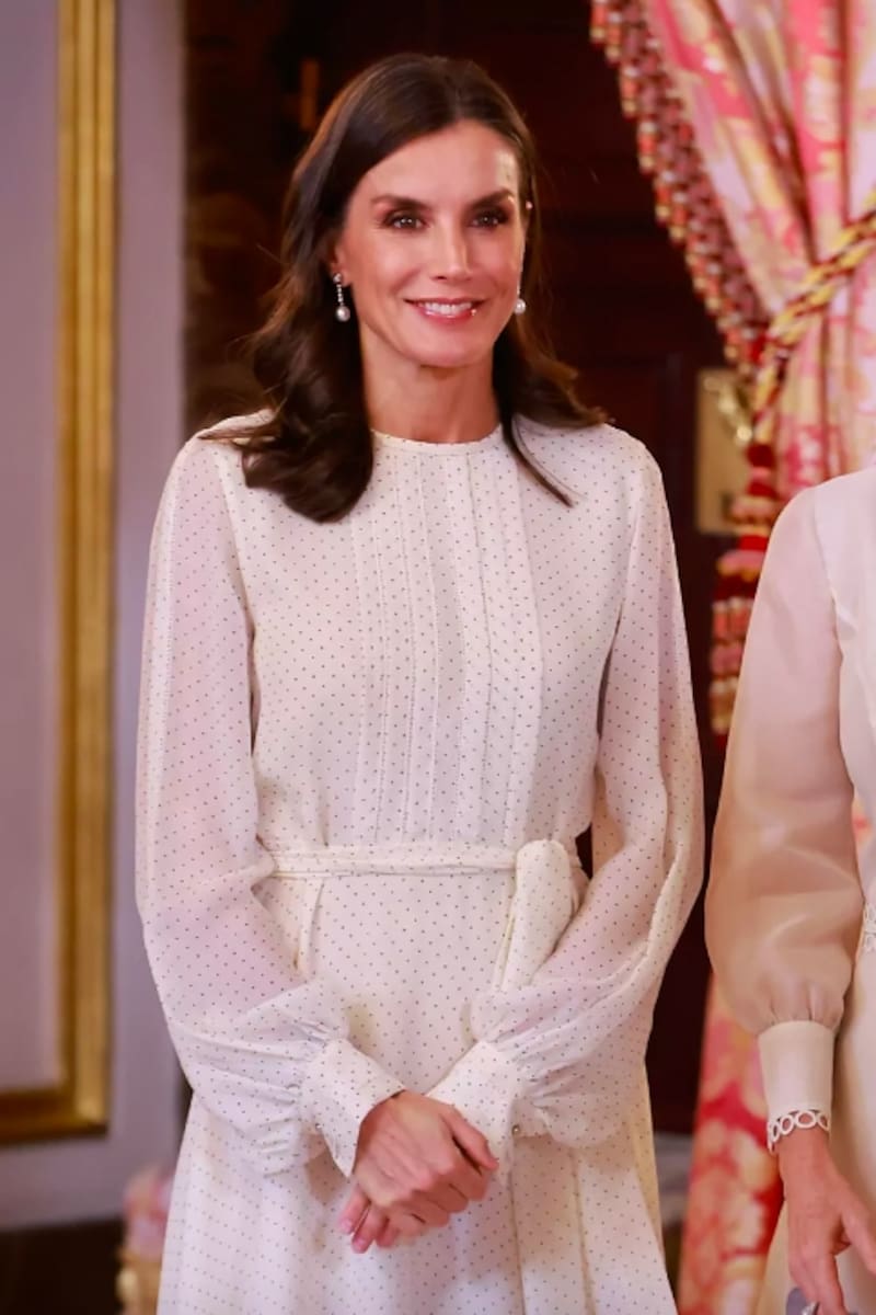 Días antes la vimos en el Palacio Real durante un almuerzo en honor al presidente de la República de Paraguay, Mario Abdo Benítez, y la primera dama, Silvana López Moreira, con un vestido color blanco y polka dots negros que su hija, la infanta Sofía, ya había llevado antes.