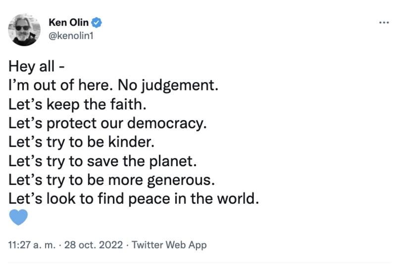 El productor ejecutivo de la reconocida serie "This is Us", Ken Olin, manifestó en su despedida su deseo e invitación a proteger la democracia: Me voy de aquí. Sin juicio. Mantengamos la fe. Protejamos nuestra democracia. Intentemos ser más amables. Tratemos de salvar el planeta. Intentemos ser más generosos.Miremos para encontrar la paz en el mundo", afirmó.