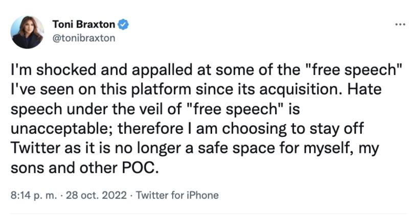 La cantante Toni Braxton también habló al respecto de su salid de Twitter: "El discurso de odio escondido bajo la libertad de expresión es inaceptable, por lo tanto, elijo permanecer fuera de Twitter porque ya no es un espacio seguro para mí ni para mis hijos", manifestó a sus 1.8 millones de seguidores.