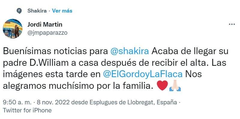 A través de redes sociales, Shakira compartió detalles de la rehabilitación de su padre, en la que ella ha tomado partido de manera muy activa, deseando de corazón que la situación para él y su madre mejoren.