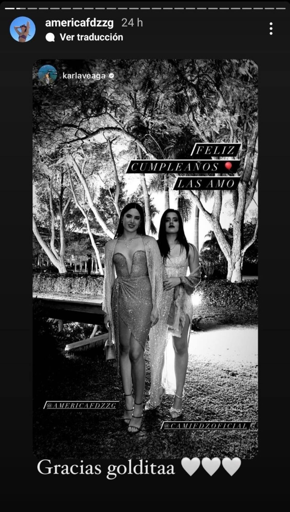 A través de sus historias de Instagram, Karla Laveaga, novia de Alejandro Fernández, compartió un especial mensaje para las mellizas Camila y América, hijas del cantante, con motivo de su cumpleaños número 25.