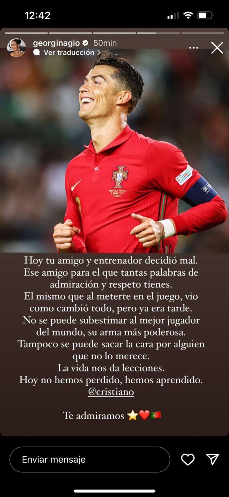 Cristiano entró por Rúben Neves al minuto 51 de juego, ya en el segundo tiempo. Georgina prosiguió en el posteo en sus historias de Instagram: "No se puede subestimar al mejor jugador del mundo, su arma más poderosa. Tampoco se puede sacar la cara por alguien que no lo merece".