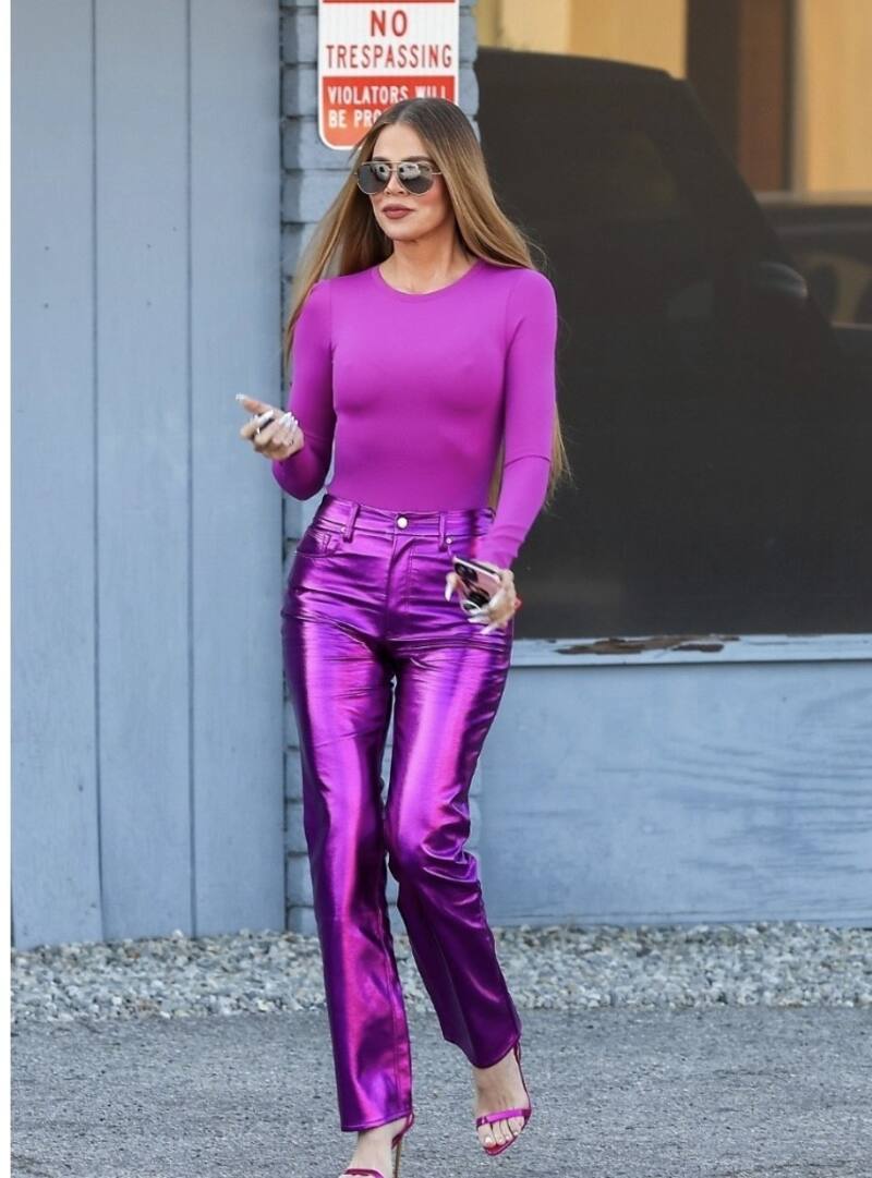 Y es que, la estrella del reality cautivó con un look muy favorecedor, sexy y atrevido. En esta ocasión uso un top morado intenso y pantalones metálicos a juego, al que le añadió unas zapatillas del mismo tono.