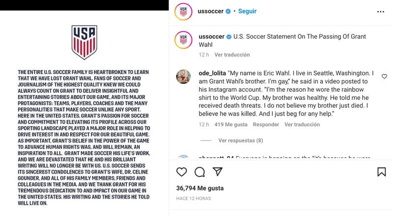 Eric Wahl subió un video a redes en el que denunció: "Mi nombre es Eric Wahl. Vivo en Seattle, Washington. Soy el hermano de Grant Wahl. Soy gay. Soy la razón por la que usó la camiseta del arcoíris en la Copa del Mundo. Mi hermano estaba sano. Me dijo que recibió amenazas de muerte. No creo que mi hermano acaba de morir. Creo que lo mataron. Y solo pido cualquier ayuda".