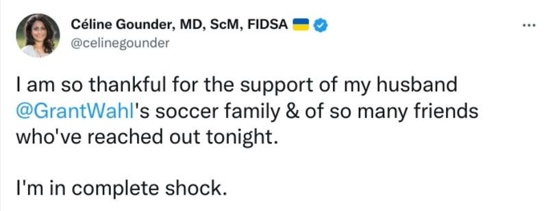 "Estoy muy agradecida por el apoyo de la familia de futbol de mi esposo @GrantWahl y de tantos amigos que se han acercado esta noche", tuiteó Celine. "Estoy en completo shock".