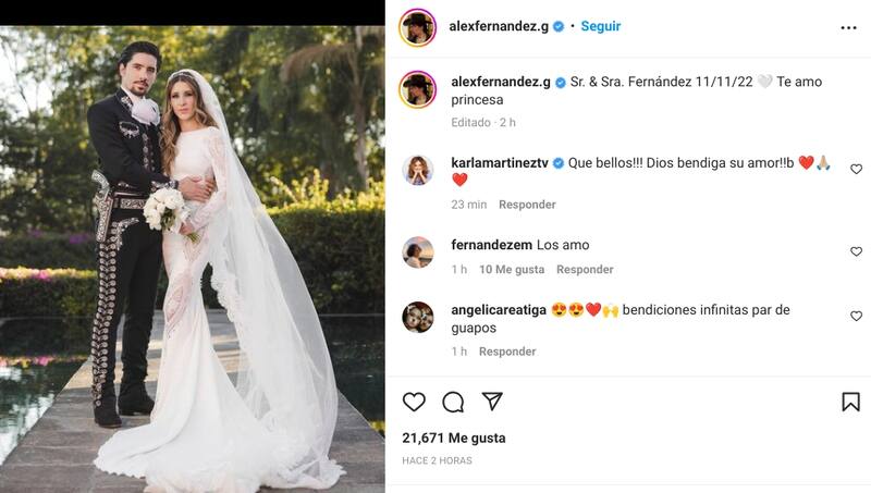 Y ahora fue la propia pareja la que compartió imágenes y videos de su celebración en sus respectivas cuentas de Instagram. Ambos subieron una imagen en la que posan para la cámara. Mientras Alexa la acompañó con el mensaje "11•11•22 Te amo @alexfernandez.g", Álex escribió: "Sr. & Sra. Fernández 11/11/22. Te amo princesa".