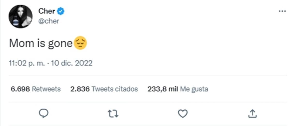 Tras en tuit de Cher muchos de sus fans y colegas de la artista la llenaron de mensajes en señal de apoyo y contención. "Oh @cher, lamento mucho saber que tu amada madre ha fallecido. Mi corazón está con vos. Qué bendición haberla tenido en tu vida durante tanto tiempo. Que descanse en paz", escribió la actriz Marg Helgenberger.
