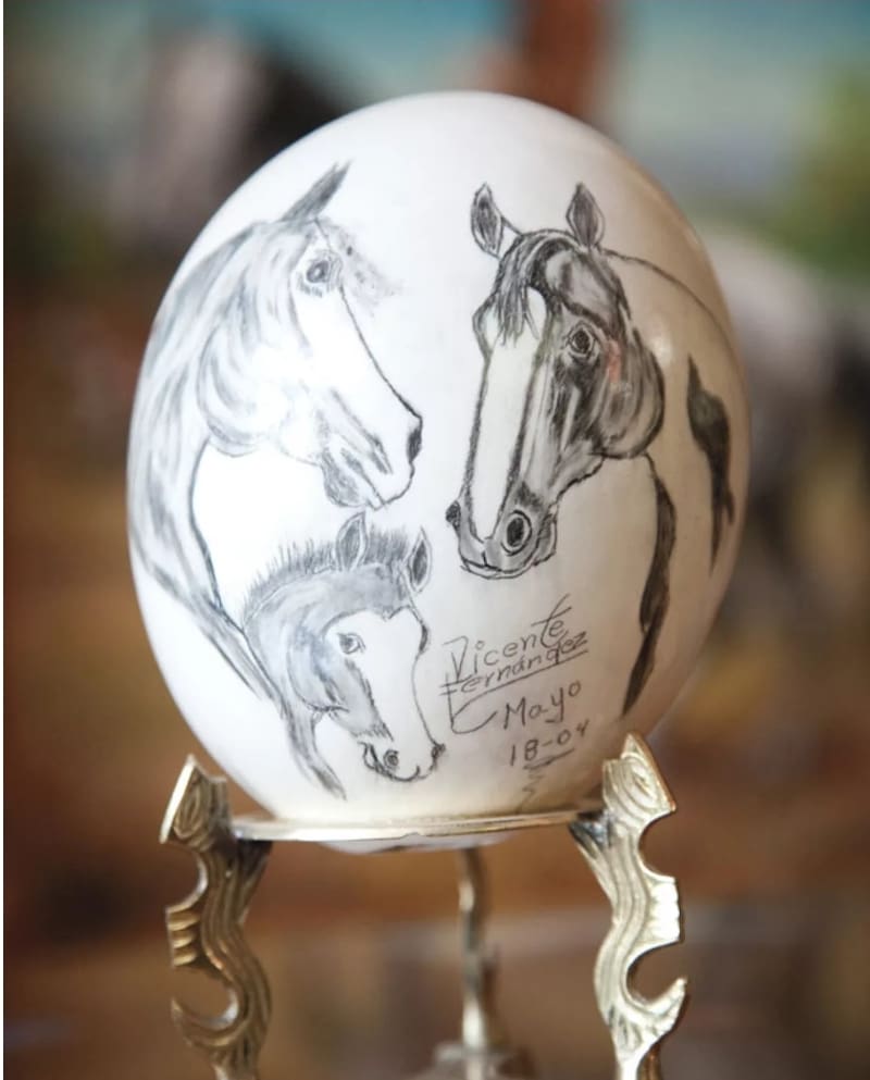 En el recorrido que hizo por su rancho, se pudo apreciar una curiosa colección que adornaba toda una pared. Eran decenas de huevos de diferentes tamaños decorados y pintados en diversas texturas y tamaños. En ese momento, sorprendió a más de uno al mostrar que le apasionaba piintar a mano huevos de gallina o avestruz.