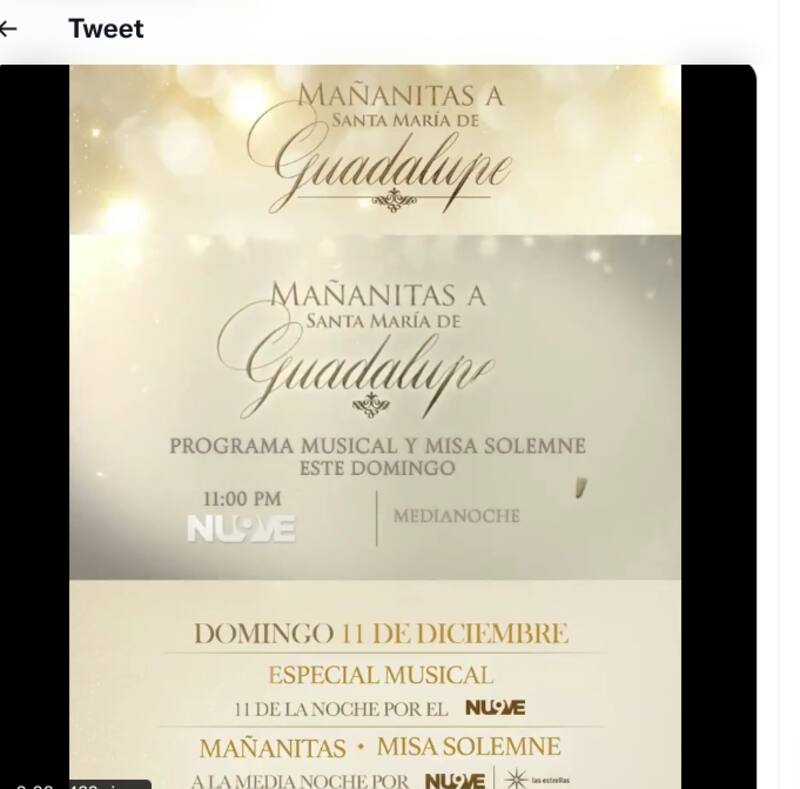 Mientras que para seguir en vivo la celebración católica por TV Azteca, deberás sintonizar el canal Azteca Uno, o bien entrar al sitio web de la televisora. La transmisión iniciará a las 23 horas del domingo 11 de diciembre.