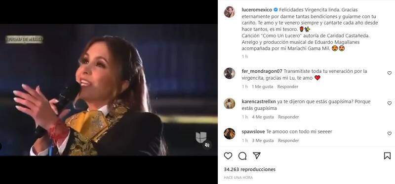 "Felicidades Virgencita linda. Gracias eternamente por darme tantas bendiciones y guiarme con tu cariño. Te amo y te venero siempre y cantarte cada año desde hace tantos, es mi tesoro", publicó al pie de un video en el que interpreta acompañada de mariachis el tema "Como un Lucero" de Caridad Castañeda.