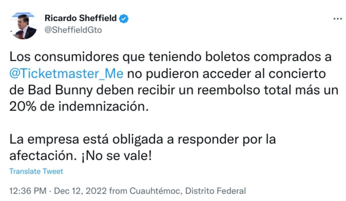 Añadió: “Tenemos 1,600 del viernes plenamente identificados, creemos que hay 200 más por identificar y 110 del sábado”. En su cuenta oficial de Twitter, expresó: "Los consumidores que teniendo boletos comprados a @Ticketmaster_Me no pudieron acceder al concierto de Bad Bunny deben recibir un reembolso total más un 20% de indemnización. La empresa está obligada a responder por la afectación. ¡No se vale!".