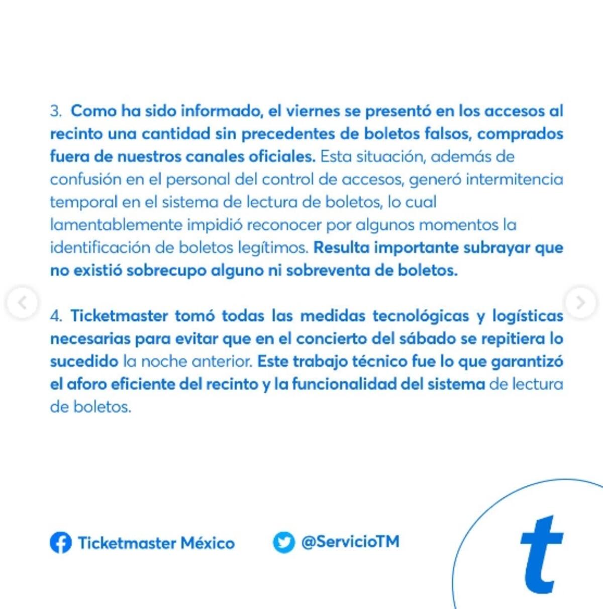 Asimismo, anotó: “Resulta importante subrayar que no existió sobrecupo alguno ni sobreventa de boletos”. Ticketmaster en varios comunicados ha insistido en que las fallas se debieron a "la cantidad inusitada" de los boletos falsos que se presentaron en los accesos. “Esta situación, además de confusión en el personal de control de acceso, generó intermitencia temporal en el sistema de lectura de boletos lo cual lamentablemente impidió reconocer por algunos momentos la identificación de boletos legítimos”.