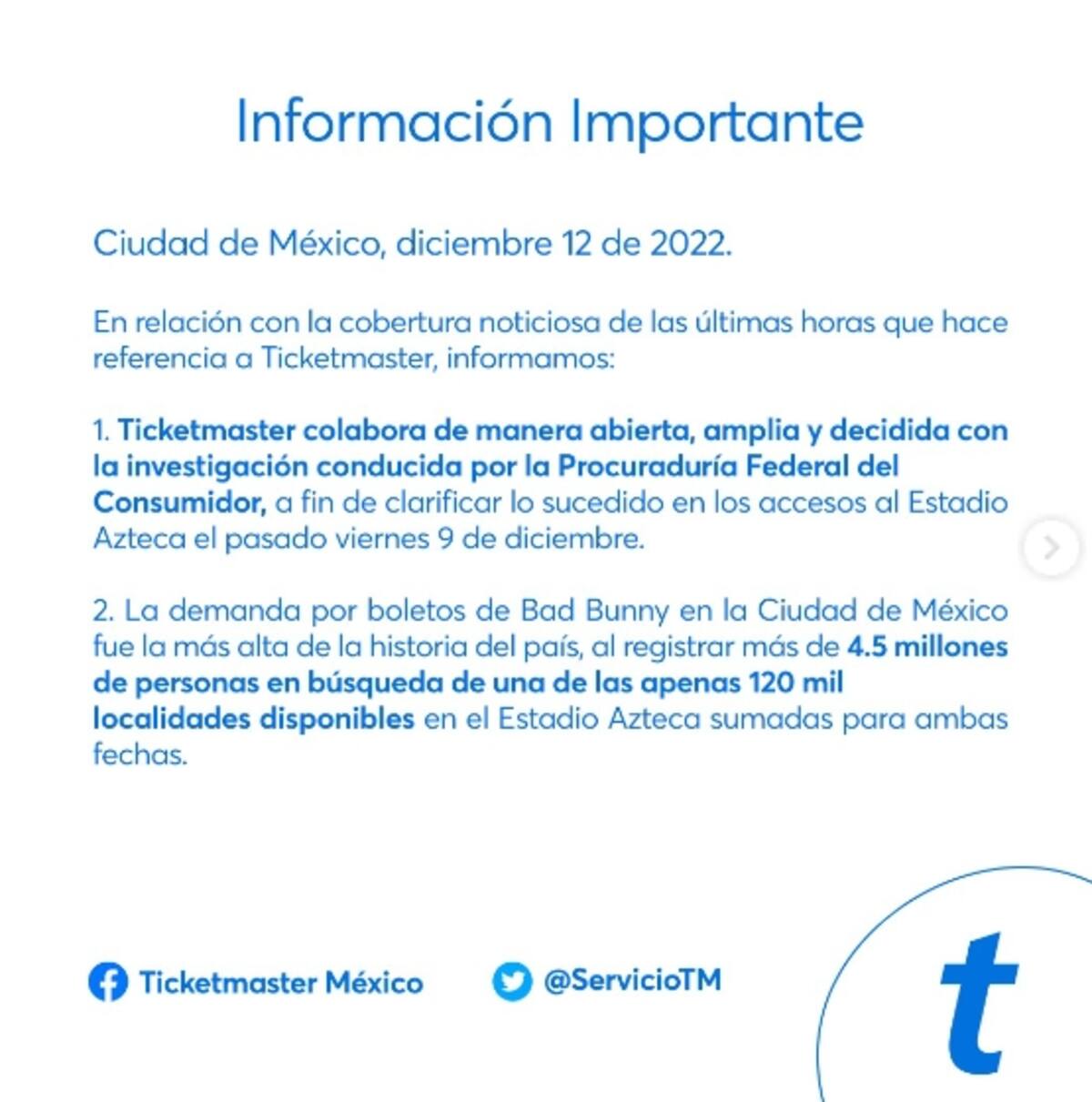 En ese comunicado, emitido el 12 de diciembre, la compañía de venta de boletaje declaró: "La demanda por boletos de Bad Bunny en Ciudad de México fue la más alta de la historia del país, al registrar más de 4.5 millones de personas en búsqueda de una de las apenas 120,000 localidades disponibles en el Estadio Azteca sumadas ambas fechas".