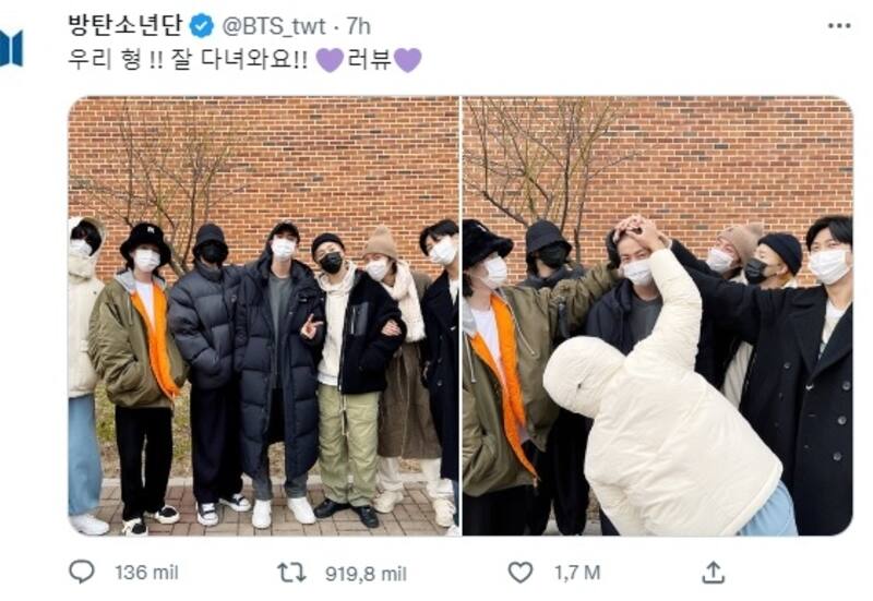 "¡¡Nuestro hyung!! ¡¡Vuelve sano y salvo!! Te amamos", escribieron en su cuenta de Twitter donde también subieron una foto de todos juntos posando con el ahora rapado Idol.