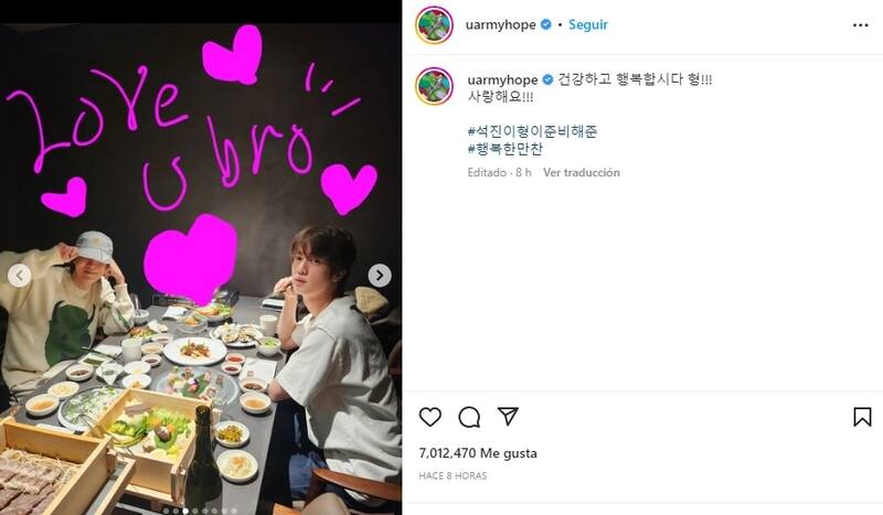 A su vez, J-Hope, a través de su cuenta de Instagram, también dedicó palabras para Jin. La estrella de k-pop le pidió que se mantenga saludable y feliz. Además, compartió tres fotos junto a Jin.