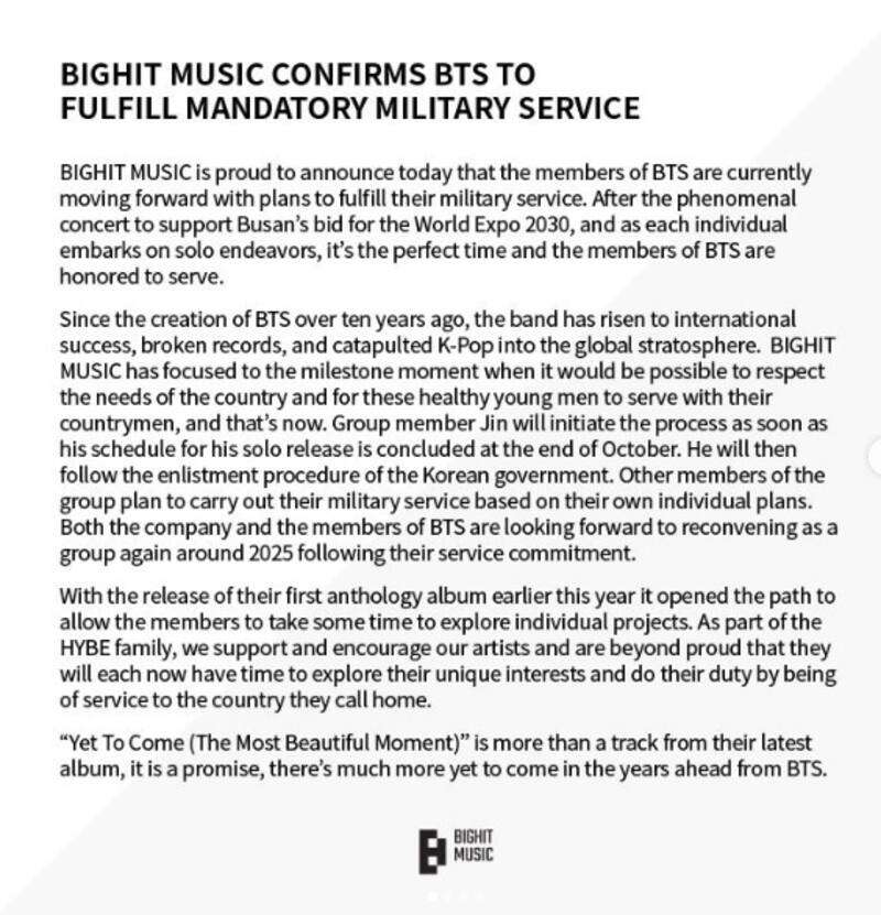 El servicio militar de Jin comenzará con un curso de capacitación básica de cinco semanas antes de ser asignado a una unidad, según la práctica estándar. Cabe recordar que en Corea del Sur todos los hombres sanos deben servir al ejercito antes de cumplir 28 años, por 18 meses.