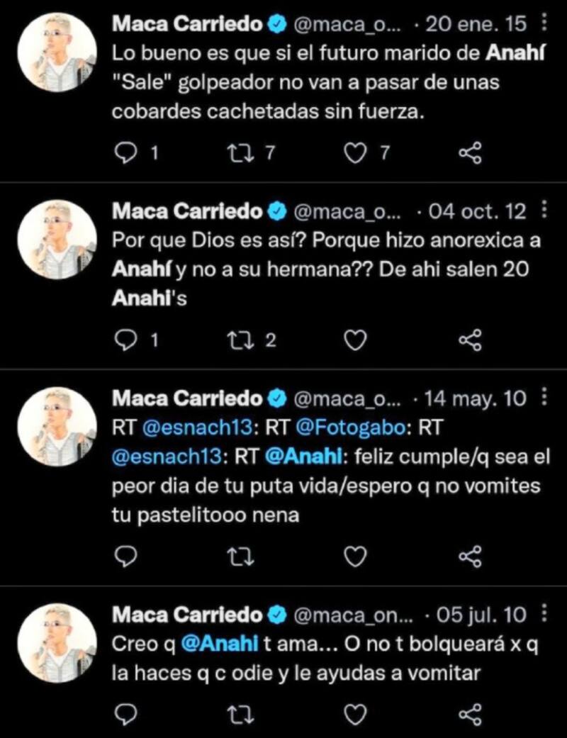 “Lo bueno es que si el futuro marido de Anahí ‘Sale’ golpeador no van a pasar de unas cobardes cachetadas sin fuerza”, escribió el 20 de enero del 2015. “Por qué Dios es así? Por qué hizo anorexia a Anahí y no a su hermana? De ahí salen 20 Anahí’s”, escribió en octubre del 2012.
