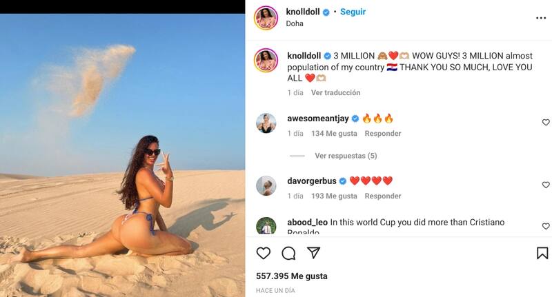 "3 MILLONES ¡GUAU CHICOS! 3 MILLONES casi la población de mi país MUCHAS GRACIAS, LOS AMO A TODOS", escribió en un texto que acompañó una foto suya de espaldas, con un bikini minúsculo en las playas de Doha.