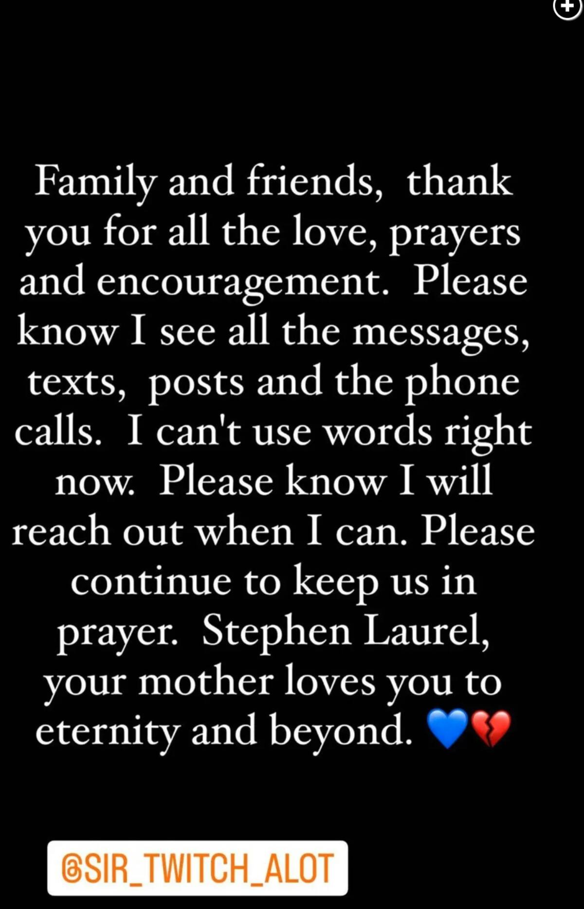 Alexander terminó su mensaje enviando algunas palabras a su hijo. “Stephen Lauren, tu madre te amá hasta la eternidad y más allá”, escribió junto a un emoji de un corazón roto.