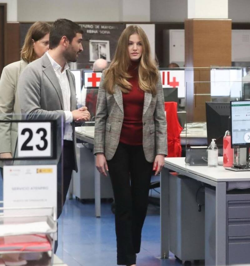 Cumpliendo con sus obligaciones como heredera al trono, Leonor se vistió con una blusa de cuello alto en color guinda, pantalones y flats en color negro. Y para darle un toque invernal a su vestimenta apostó por un blazer de Carolina Herrera que le pertenece a su madre, la reina Letizia.