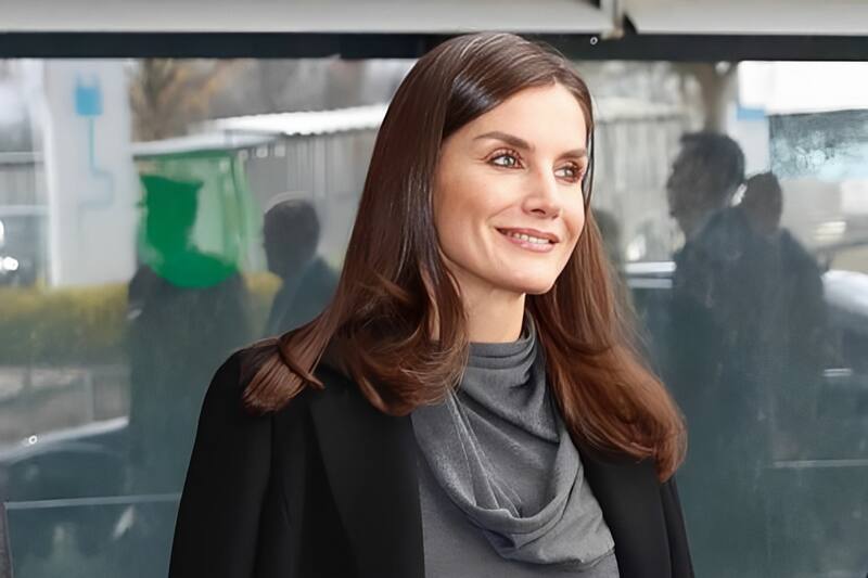 Para esta ocasión, la esposa del rey Felipe, quien ha estado marcando tendencia con sus looks en esta temporada, estrenó un sedoso vestido de cuello bufanda con botas sobre la rodilla con un outfit en escala de grises, que resultó perfecto y muy favorecedor para un día frío y lluvioso.